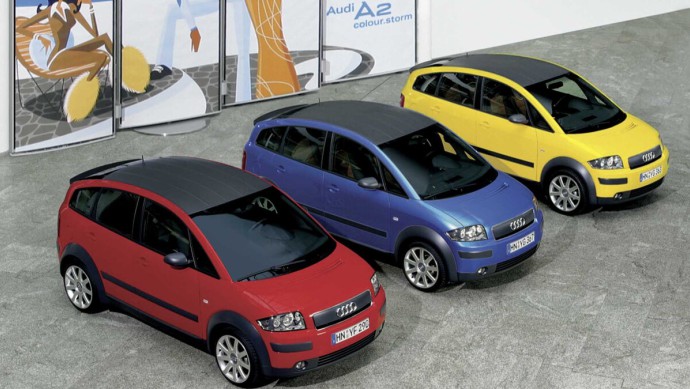 Er kommt im Jahr 2000 auf den Markt – und polarisiert sofort: der Audi A2. Mit seiner innovativen Aluminiumkarosserie ist der Kompaktwagen leicht, aerodynamisch und sparsam im Verbrauch. Fünf Motorvarianten stehen zur Auswahl; der A2 1.2 TDI sorgt als erstes viertüriges Drei-Liter-Auto der Welt für Aufsehen und von 2003 bis 2005 zieht das Sondermodell "colour.storm" mit seinen besonderen Lackfarben die Blicke auf sich.