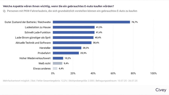 Civey hat vom 10. bis 28.07.2025 für die DEVK 2.500 Personen mit Pkw-Fahrerlaubnis befragt sowie 2.000 Personen mit Pkw-Fahrerlaubnis, die sich grundsätzlich vorstellen können, ein gebrauchtes E-Auto zu kaufen. Die Ergebnisse sind aufgrund von Quotierungen und Gewichtungen repräsentativ unter Berücksichtigung des statistischen Fehlers von 3,1 bis 4,4 Prozentpunkten beim jeweiligen Gesamtergebnis.