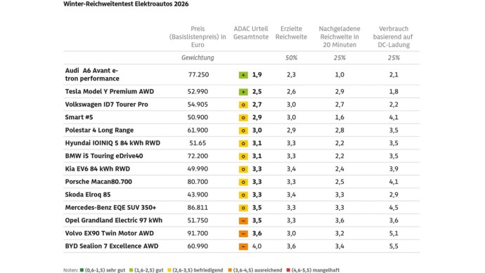 Niedrige Temperaturen im Winter setzen Elektroautos spürbar unter Druck: Ihre Reichweite schrumpft, teils deutlich. Wie groß Unterschiede zwischen einzelnen Modellen und Herstellern ausfallen können, hat der ADAC nun in einem vergleichenden Labortest untersucht. Dabei traten 14 Fahrzeuge von 14 Marken unter identischen Bedingungen gegeneinander an. Als bestes Gesamtpaket setzte sich der Audi A6 Avant E-Tron durch.