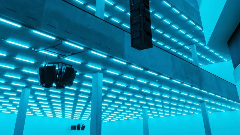 Ein Meer aus LED-Röhren taucht den Schauraum in wechselnde Farben: blau, magenta, rot, orange. Der Blick verliert sich im linearen Lichtmuster – so recht weiss man nicht, wo die gigantischen Wände enden und wo sie beginnen. Einzelne Basstöne und jazzige Harmonien verstärken den Sog.