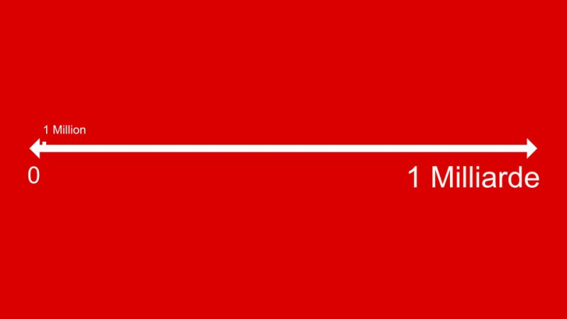 Denn tatsächlich ist eine Million auf einem solchen Datenstrahl beinahe ganz links neben der Null. Eine Milliarde besteht nämlich aus tausend Millionen. Eine Million entspricht also genau einem Tausendstel des Strichs oder 0,1 Prozent. Bei einer Billion ist es genauso: Hat man eine Milliarde, fehlen noch 999 Milliarden, bis man eine Billion hat. Der Unterschied zwischen einer Milliarde und einer Billion ist fast genau eine Billion.