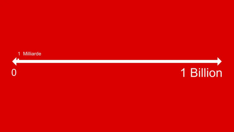 Denn tatsächlich ist eine Million auf einem solchen Datenstrahl beinahe ganz links neben der Null. Eine Milliarde besteht nämlich aus tausend Millionen. Eine Million entspricht also genau einem Tausendstel des Strichs oder 0,1 Prozent. Bei einer Billion ist es genauso: Hat man eine Milliarde, fehlen noch 999 Milliarden, bis man eine Billion hat. Der Unterschied zwischen einer Milliarde und einer Billion ist fast genau eine Billion.