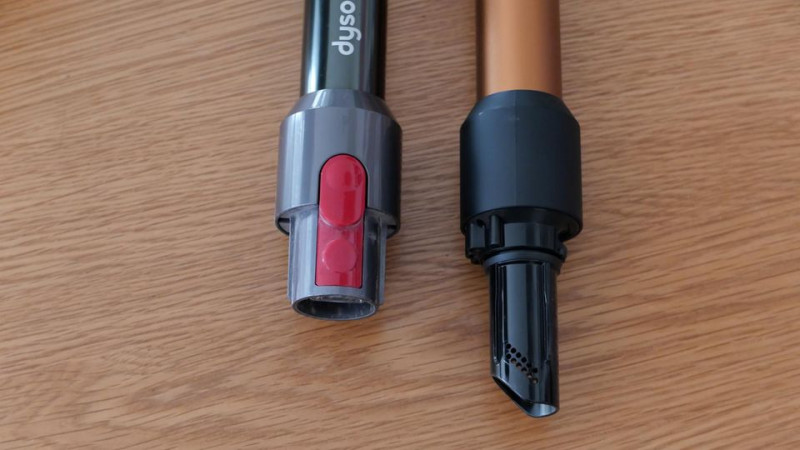 Auch die Überarbeitung des Aufsatzsystems ist sehr gelungen. Hier hat Dyson gleich zwei Fliegen mit einer Klappe geschlagen. Bisher waren die Aufsätze so aufgebaut, dass man sie ins Rohr oder den Korpus des Saugers einstecken musste. Das führte dazu, dass der Sauger ohne Aufsatz nicht zu benutzen war. Wollte man nur eine schmale Kante saugen, musste man erst den Bodenaufsatz abnehmen, dann auf einen Stabaufsatz wechseln, diesen nach getaner Arbeit wieder abnehmen und schließlich wieder zum Bodenaufsatz wechseln.