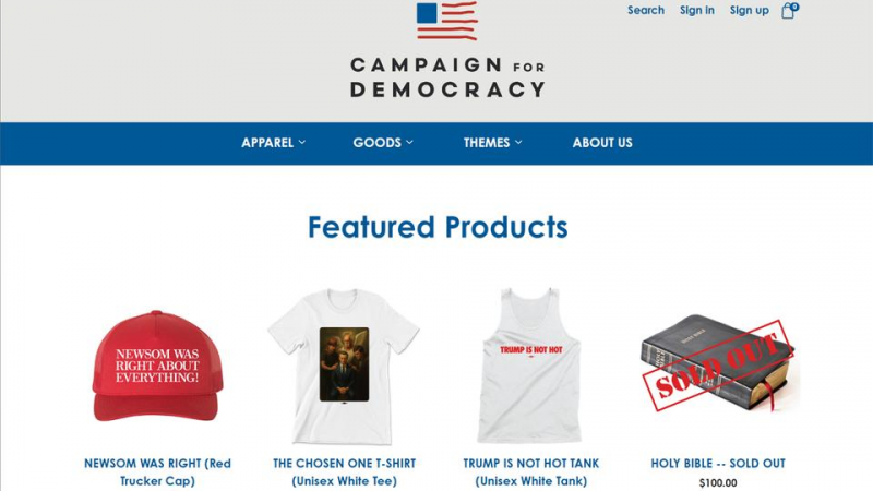 "Newsom hatte mit allem Recht", steht auf der roten Mütze, Kosten: 32 US-Dollar. Für den gleichen Preis gibt es auch das "Trump ist nicht hot"-Trägershirt. Die "Heilige Bibel" für 100 US-Dollar ist angeblich ausverkauft.