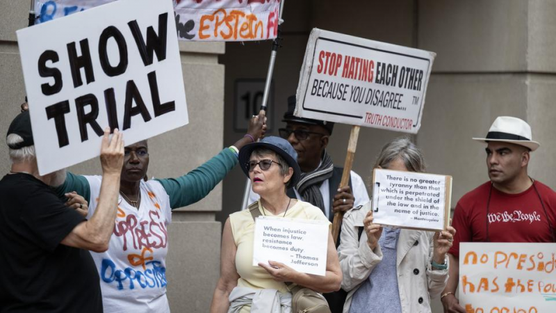 Vor Comeys Ankunft hatten sich einige Demonstranten vor dem Gerichtsgebäude versammelt. Auf Plakaten waren Aufschriften zu lesen wie "Schauprozess", "Unterdrückung der Opposition" und "erfundene Anschuldigungen".
