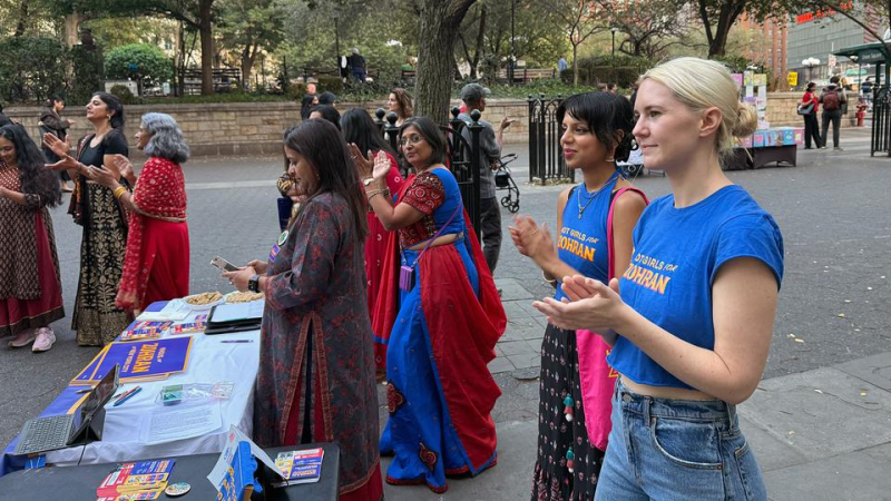 Union Square, in der Rushhour: Kathleen und Ananya von den "Hot Girls for Zohran" bauen ihren Klapptisch mit den Stickern und Infos auf, gleich neben den "Indians for Zohran". Zu indischen Klängen tanzen die Frauen über den Platz, Passanten reihen sich spontan ein. Die Botschaft: Hoffnung statt Hass, gute Laune statt Weltuntergangsstimmung.