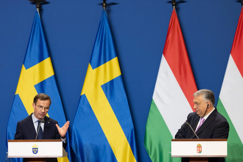 Kristersson und Orbán 23. Februar 2024 bei Unterzeichnung ihres Abkommens über WaffenlieferungenBildrechte: IMAGO / XinhuaIm Februar 2024 hatte Schweden für die lange offene Zustimmung des ungarischen Regierungschefs Viktor Orbán zum Nato-Beitritt der Schweden vier weitere Gripen-C-Jets bekommen, mit neuem Radar und Fähigkeit zum Abschuss der Luftkampf-Marschflugkörper "Meteor".