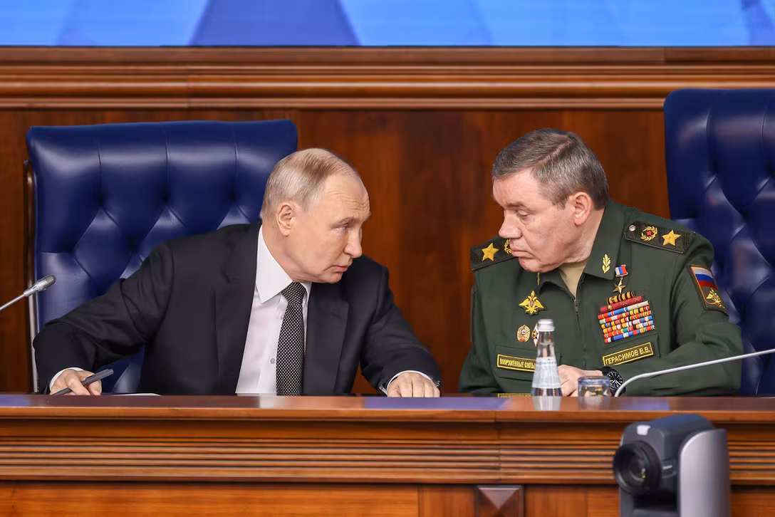 Bei einem durch Fernsehbilder jetzt öffentlich gemachten Treffen mit Militärs hat sich Russlands Präsident Wladimir Putin von Generalstabschef Waleri Gerassimow von Erfolgen der russischen Armee berichten lassen.