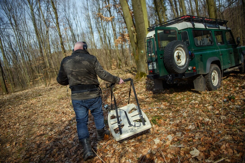 Piotr Koper, Bauunternehmer und Schatzsucher, geht mit einem Metalldetektor durch einen Wald. Der Unternehmer ist maßgeblich für die Suche nach einem verborgenen Tunnelsystem und dem sogennanten "Goldzug" aus der NS-Zeit in der Stadt Waldenburg in Polen verantwortlich.Bildrechte: picture alliance/dpa | Gregor FischerStaat stellt sich auf die Seite der Schatzsucher