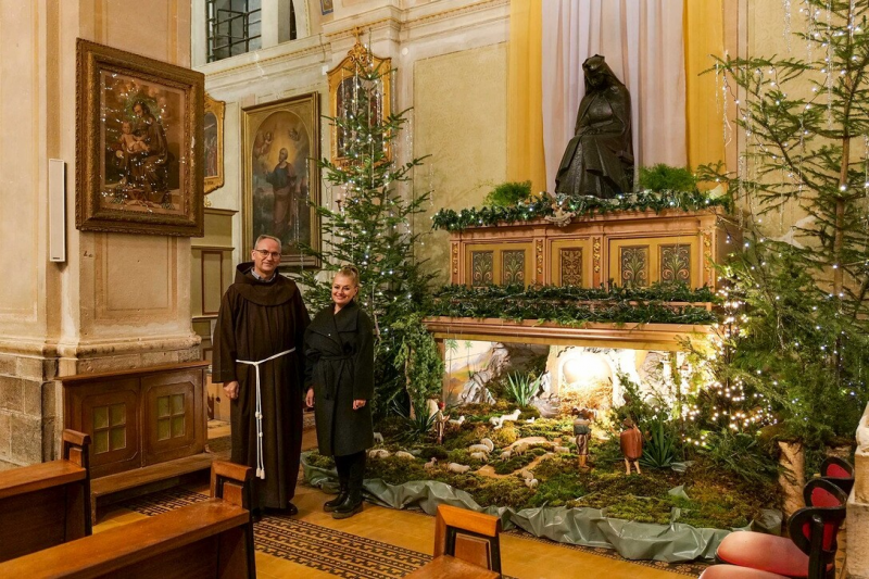 Auch der Altar und die Christbäume in der Johannes-der-Täufer-Kirche sind bescheiden geschmückt. Nur die große Krippe fällt auf. Prächtig steht sie zu Füßen der Statue der vorletzten bosnischen Königin Katharina, die im 15. Jahrhundert hier lebte und die Franziskaner unterstützte. Frisches Moos und Heu schmücken sie. "Franz von Assisi war der erste Umweltschützer. Und wussten Sie, dass er der Erfinder des Krippenspiels ist? Er war der erste, der die Geburt Christi mit echten Menschen und Tieren darstellen ließ, um diese biblische Geschichte den Menschen näher zu bringen."