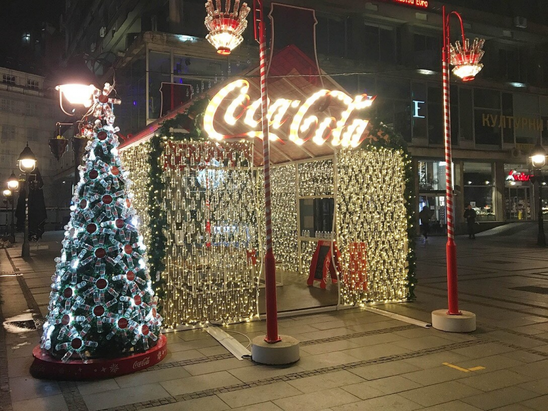 Coca-Cola - in der Kindheit unseres Ostbloggers Andrej schon ein Begriff und heute Teil der Weihnachtsbeleuchtung in BelgradBildrechte: MDR/Andrej IvanjiDie Geschenke wurden am 31. Dezember unter den geschmückten Weihnachtsbaum, der "Neujahrstanne" hieß, gelegt und ich wartete fieberhaft darauf, sie am Morgen des 1. Januar auszupacken. Im Theater, wo meine Eltern arbeiteten, verteilte der Weihnachtsmann mit dem rot-weißen Gewand, dem weißen Rauschebart und den grauen Haaren persönlich Geschenke an Kinder – nur hieß er eben "Deda Mraz", im russischen "Дед Мороз", auf Deutsch "Väterchen Frost". Ich erinnere mich auch, dass dieser rot-weiße Weihnachtsmann nach dem Vorbild von Santa Claus aus der Coca-Cola-Werbung mit Geschenken in meinen Kindergarten in Belgrad kam. Auch wenn ich nichts über Weihnachtsbräuche wusste, Coca-Cola kannte ich schon.