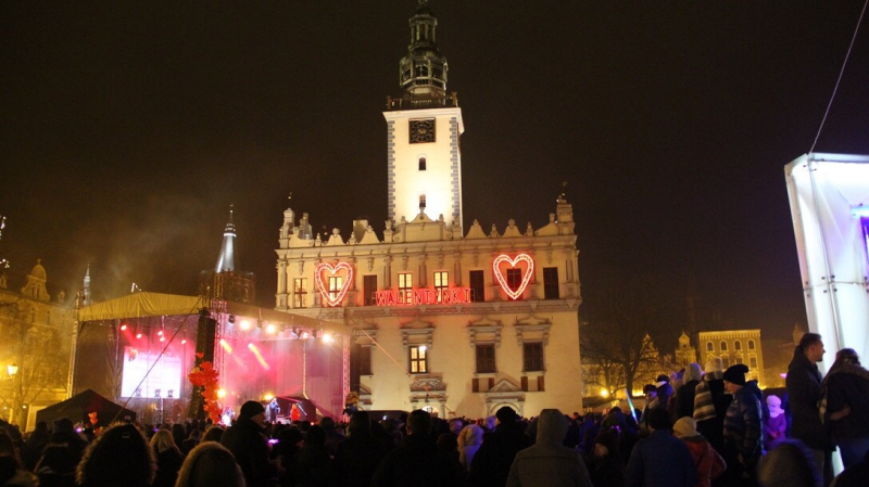 Jedes Jahr zum Valentinstag am 14. Februar finden auf dem Rathausplatz in Chełmno Live-Konzerte statt.Bildrechte: Elżbieta PawelecAm Valentinstag gibt es Live-Konzerte vor dem beleuchteten historischen Renaissance-Rathaus. Verliebte lassen hunderte Luftballons in Herzform in den Himmel steigen. Bäcker und Konditoren backen herzige Köstlichkeiten.