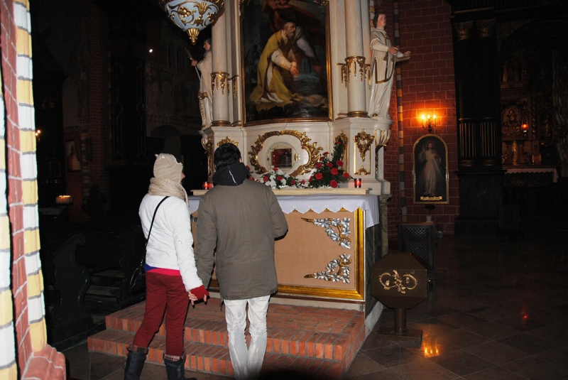 Paare pilgern das ganze Jahr über in die Pfarrkirche nach Chełmno. Im Altar befindet sich eine Reliquie des Heiligen Valentin - dem Schutzpatron der Liebenden.Bildrechte: Elżbieta PawelecIn der Pfarrkirche entstand 1715 ein neuer Altar für den Heiligen Valentin. Am Vorabend des 14. Februar wurde im 18. und 19. Jahrhundert die Reliquie in einer Prozession in die Heilig-Geist-Kirche überführt, dort auf dem Hauptaltar aufgestellt und angebetet. Anschließend gab es erneut eine Prozession, in der sie wieder in die Pfarrkirche gebracht wurde.